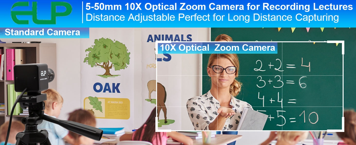 1/2.5” OmniVision OX05B1S lightburn camera. The OmniVision OX05B1S sensor works with as little as 0.1 LUX. 5-50mm 10x optical zoom camera for recording lectures. CS Mount varifocal lens interchangeable.