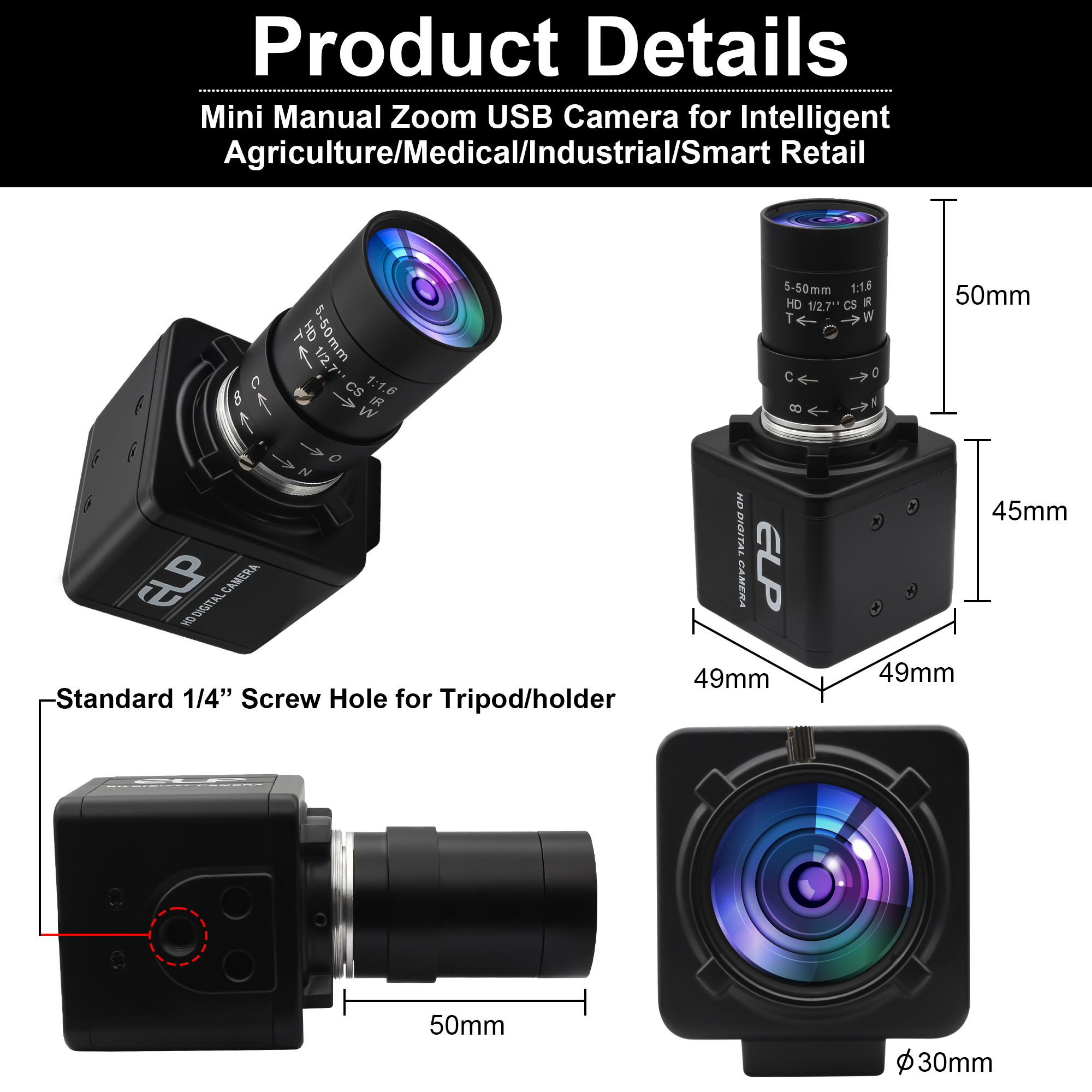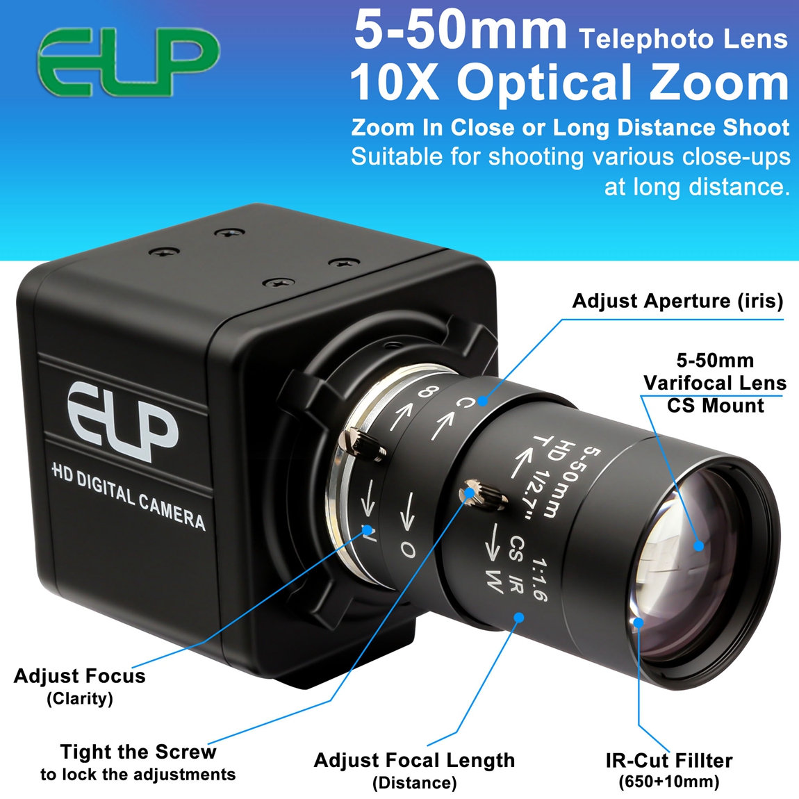 ELP Global Shutter USB Webcam High Speed 5mp@50fps 1440P@60fps Industrial Video Camera with 5-50mm 10X Zoom Lens Variable Focus Close-up PC Camera CS Mount UVC