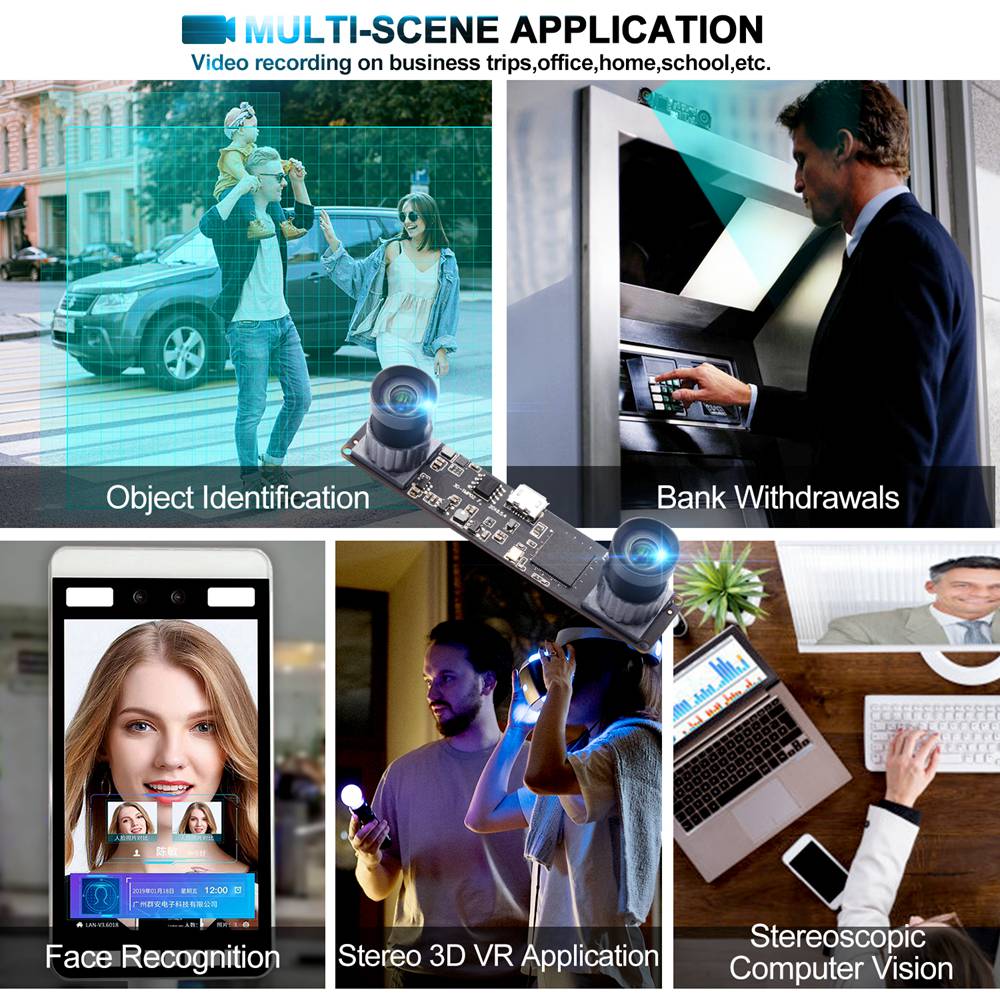 Features[1.3MP USB Camera With OV9715 Sensor ] Dual Lens USB Camera Resolution 1.3megapixels ,Max 1280x960 each image ,combined 2560x960P . Adopt to high 1/3 inch CMOS OV9715 Sensor ,powered by USB2.0 interface. [Synchronized Frames Technology]1.3MP HD 960P stereo 3D VR dual lens usb camera with dual lens frame synchronization provide side by side image, two lens work at the same time . [High Speed 2560X960 @ 60fps Webcam]:1.3MP 960 dual lens camera module with high frame rate can get MJPEG:2560X960@ 60fps/2560X720@60fps /1280X480@60fps /640X240@60fps. perfectly synchronized stereo images [Mini Synchronized Dual Lens Webcam with No Distortion Lens ] 1.3MP Webcamera utilizing the disparity between the two lenses through algorithms,Allow MACHINE to see the world as we do.Passive stereo vision designed for environment versatility and featuring long-range capabilities and high-resolution depth perception.Small outline 80*16.5mm for embedded application [Best Universal Compatibility]: Webcam support USB 2.0 OTG,plug&play. USB camera is versatile for Skype, OBS, Zoom, GoToMeeting, Facebook LIVE, and YouTube Livestreaming services etc. Widely works with WinXP/Vista/Windows 7/8,Windows 10 Linux with UVC(above linux-2.6.26)MAC-OS X 10.4.8 or later Wince with UVC Android 4.0 or above with UVC. [Widely Application ] 960P Dual Lens USB Camera is widely used for Face recognition, object identification, motion tracking, mapping, and AR & VR applications can integrate seamlessly,suitable for stereo 3D VR application like people counting system,stereoscopic computer vision .