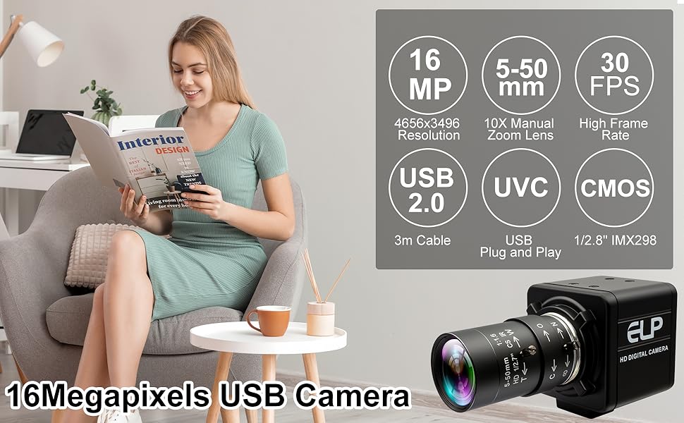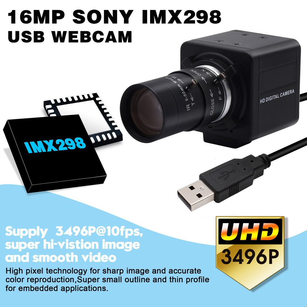 ELP High Definition 16MP Zoom Camera 10X 4X CS Manual Focus Varifocal Lens RGB IMX298 HD Color USB Industrial Camera For Observing (Model:ELP-USB16MP01-MFV )